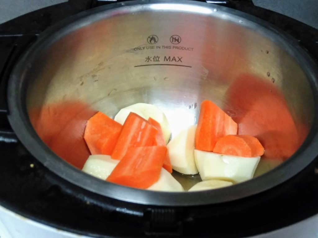 - ホットクック「無水調理」でじゃがいもと人参を「20~25分」加熱(公式では15分ですが、じゃがいもが固いことがあるので少し長めにしています)